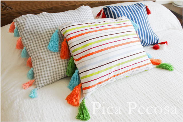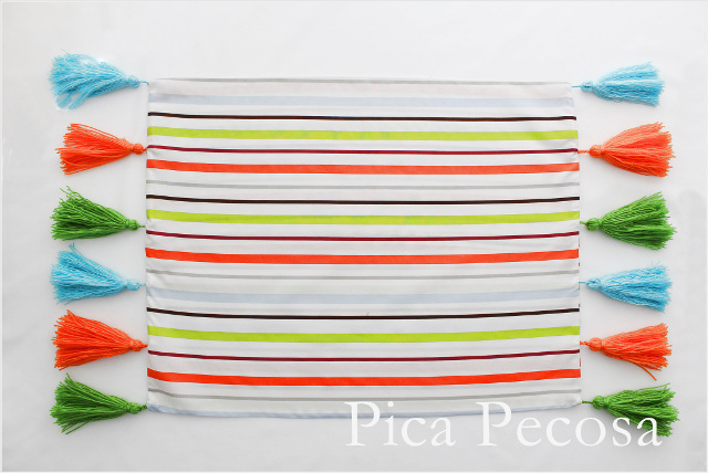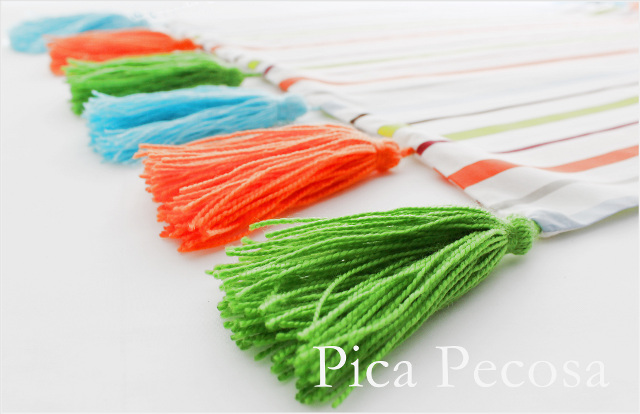 Este de rayas de colores es tan alegre que la pizca de gracia se la dí con el tamaño de las borlas, que hice mucho más largas de lo habitual: