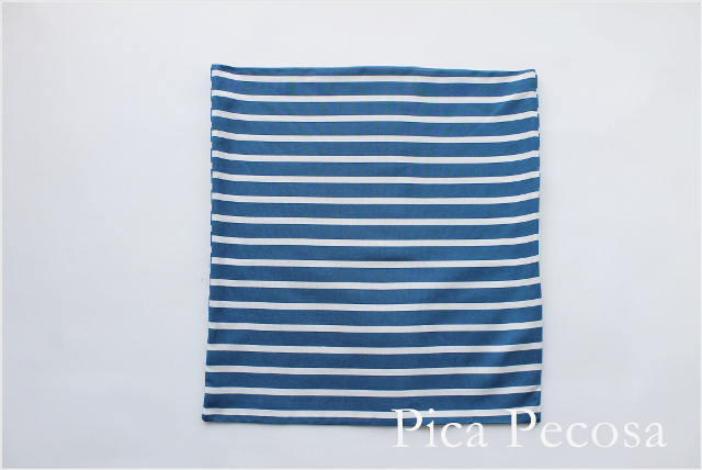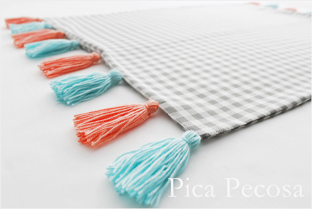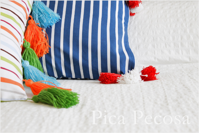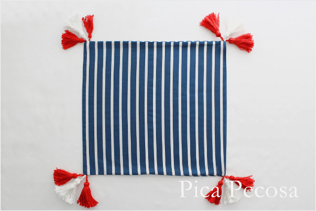 El último que añadí a la colección es este tan marinero de rayas azules y blancas. Es más pequeño y cuadrado que los otros dos, por eso en lugar de poner las borlas a los lados las cosí a las esquinas de tres en tres: