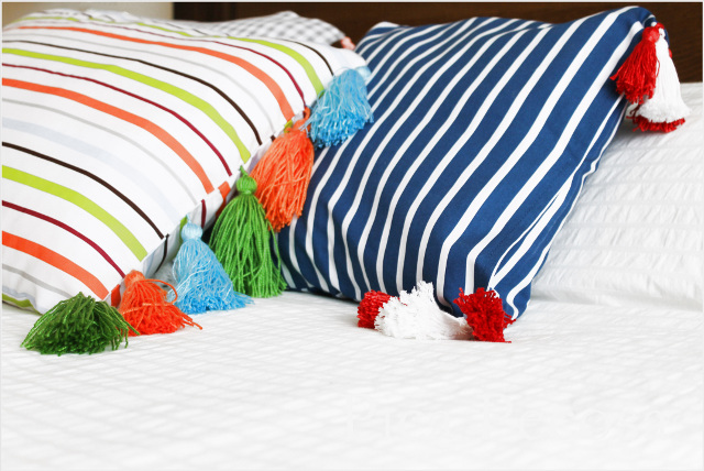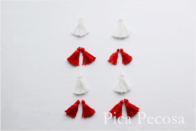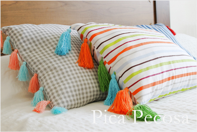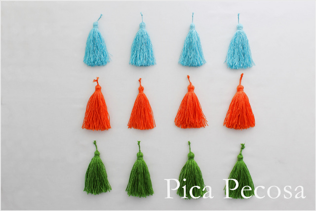 Recuerdo que la idea de ponerles las borlas se me ocurrió cuando vi los de la foto número dos en esta selección hecha por la diseñadora textil Rebekah Guinda (aquí). Me gustó todo: cómo quedaban con ellas y la combinación de colores.