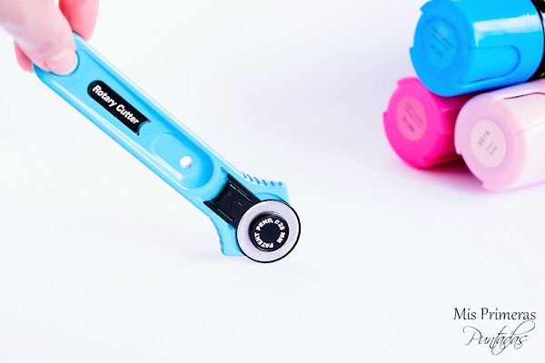 Como te iba diciendo, mi cutter rotatorio, a pesar de ser una de mis herramientas preferidas de costura, es basante feucha. ¡Y a mí me gustan las cosas bonitas! Y si son de colores pasteles.... ¡mejor que mejor! Así que con el objetivo de tener herramientas de costura bonitas (te vas a morir de la envidia cuando me lleguen los alfileres que encargué el otro día) decidí pintar mi cutter con pintura en spray en color azul.