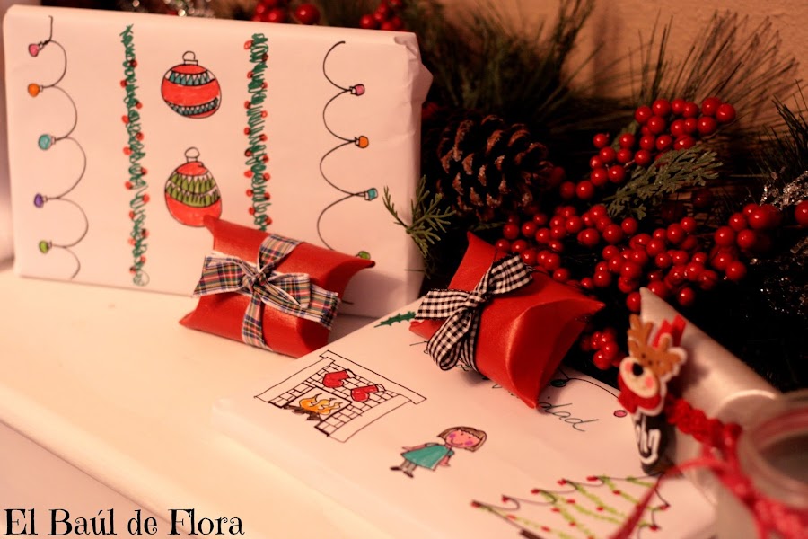 Ahora los decoramos con lazos, pinzas navideñas, restos de cintas que tengamos y etiquetas con el nombre del destinatario del regalo. Quedan muy bonitos. También nos valen para decorar algún rincón navideño.