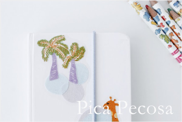 Me acordé de un retal de tela que me encanta porque tiene unas jirafas muy graciosas, así que las recorté y las pegué en las tapas haciendo una divertida combinación: