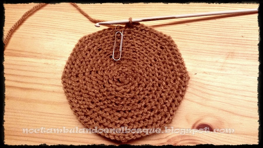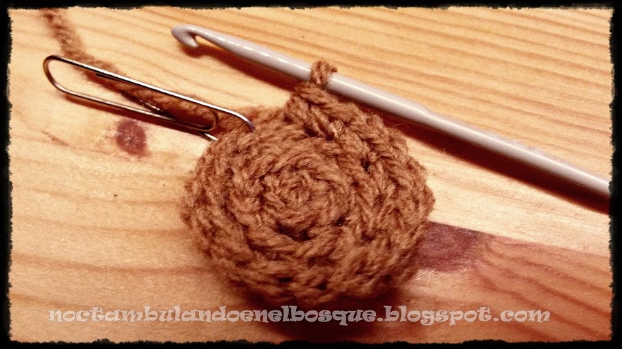Vuelta 3: 2 puntos bajos en cada cadeneta (16 puntos en total). Lo que estamos haciendo son vueltas de aumentos . Como vamos a tejer en espiral os podéis ayudar de un clip para no perder el primer punto, como en la foto de abajo.