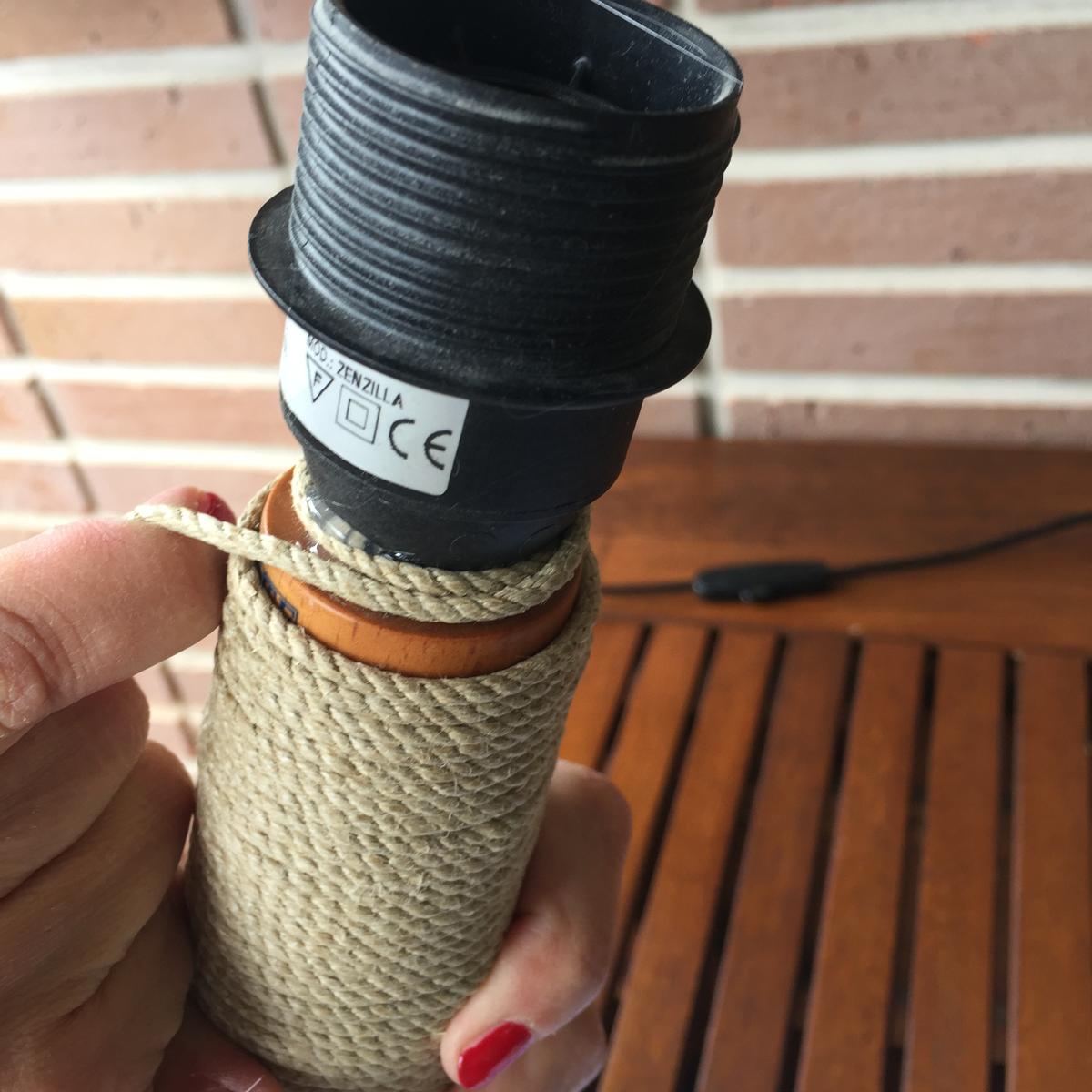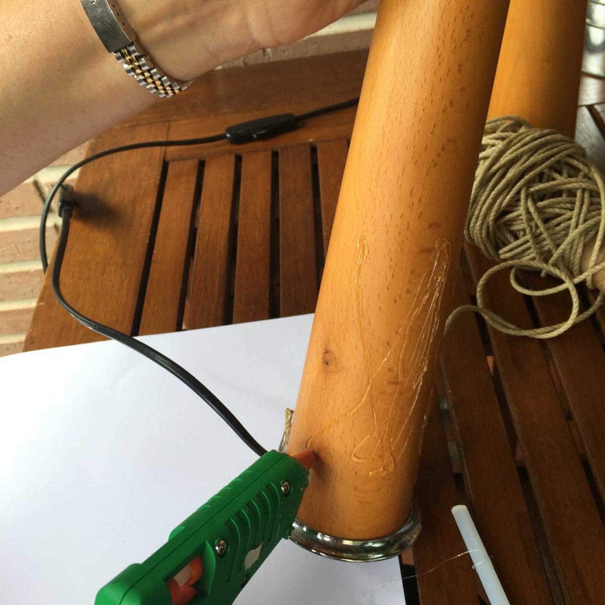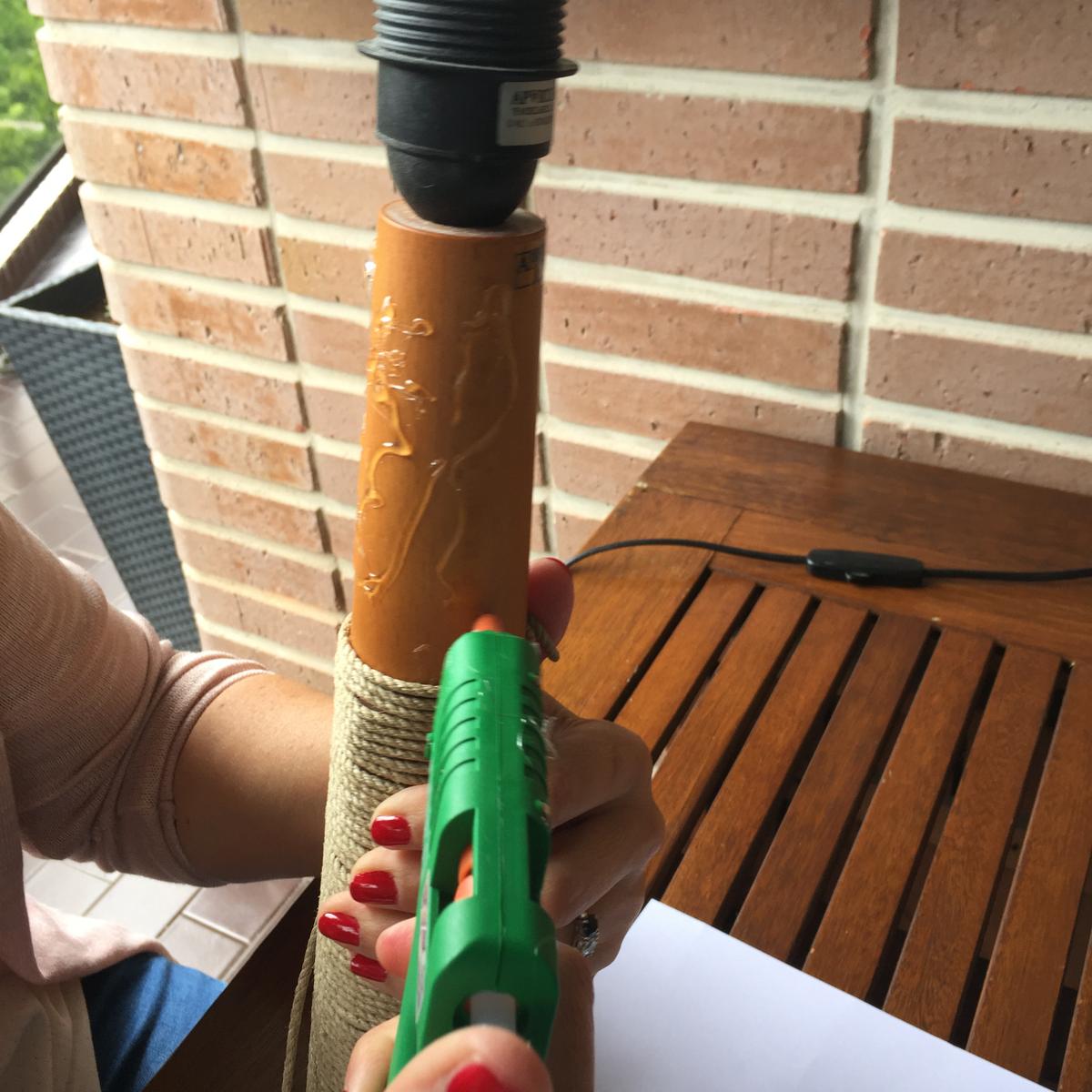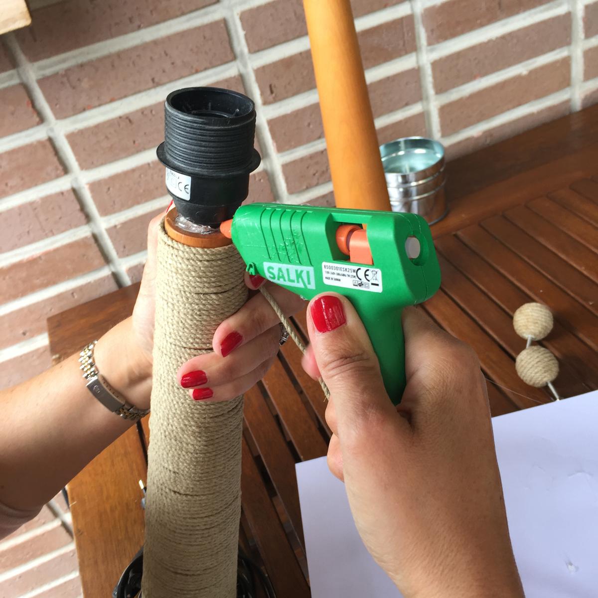 La técnica es muy sencilla, empezamos poniendo un buen punto de silicona en el extremo de la cuerda para que quede bien sujeto al pie de la lámpara, y empezamos a enrollar la cuerda en forma circula, de arriba abajo, colocando tiras de silicona a lo lardo del pie de la lámpara para conseguir una mejor fijación.