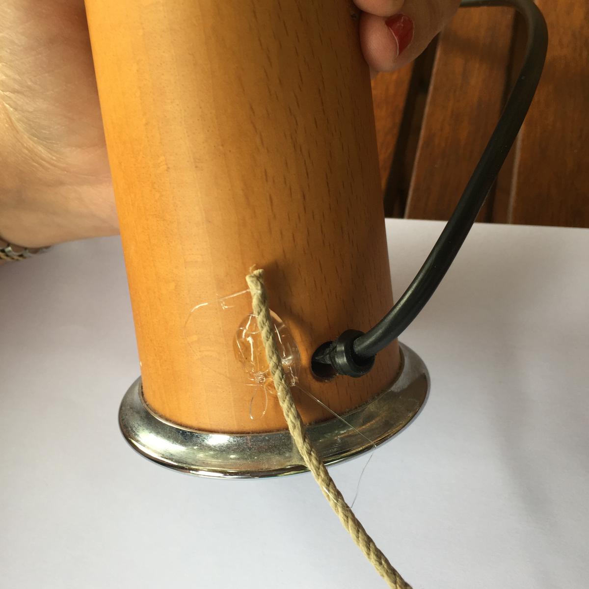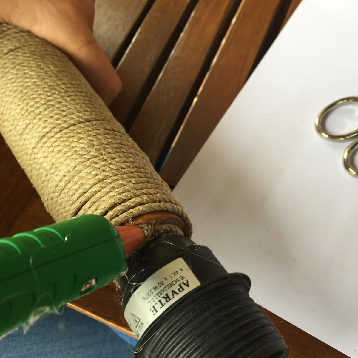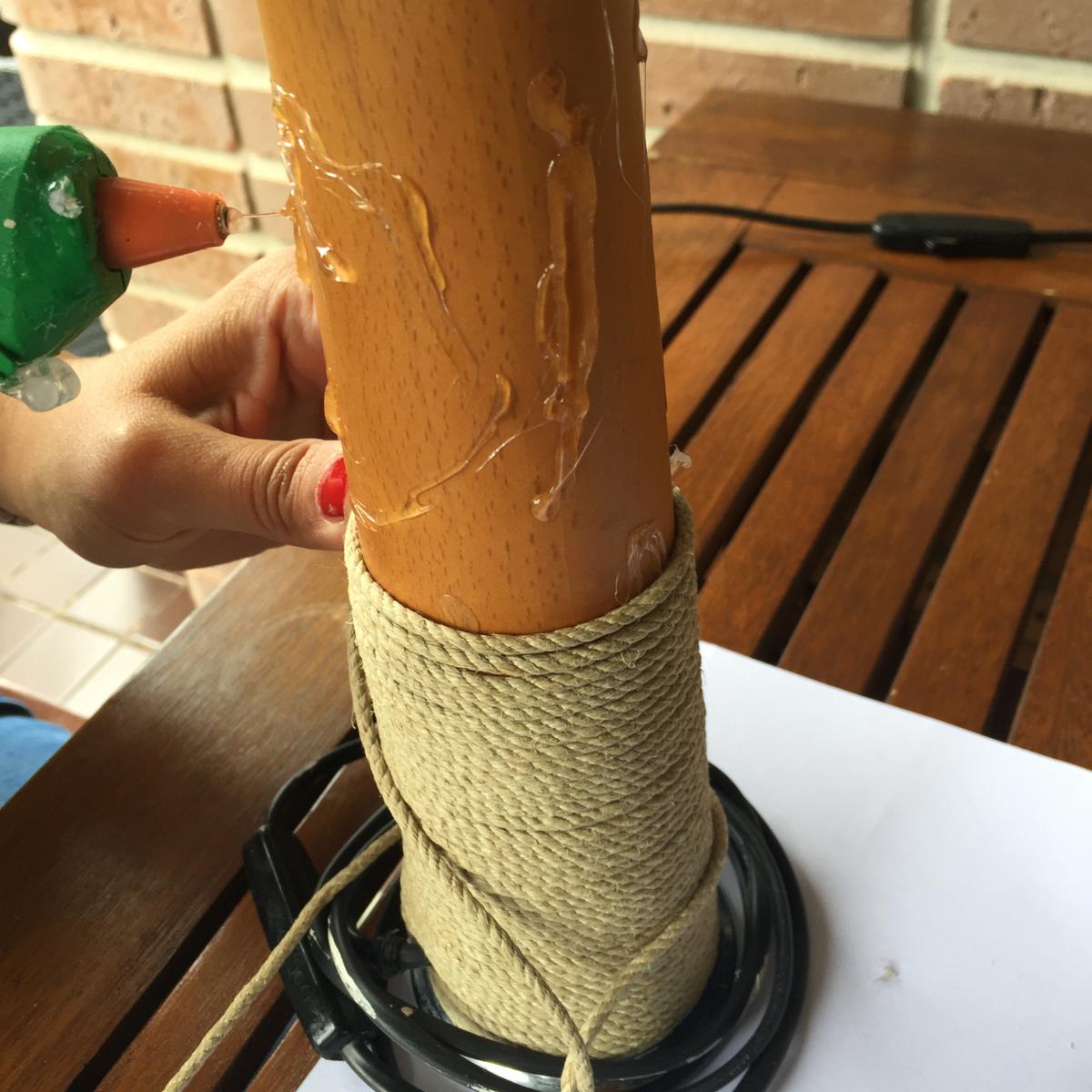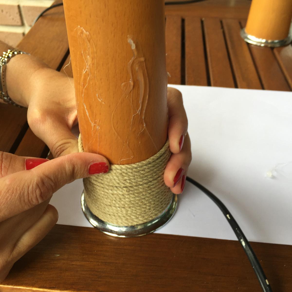 La técnica es muy sencilla, empezamos poniendo un buen punto de silicona en el extremo de la cuerda para que quede bien sujeto al pie de la lámpara, y empezamos a enrollar la cuerda en forma circula, de arriba abajo, colocando tiras de silicona a lo lardo del pie de la lámpara para conseguir una mejor fijación.
