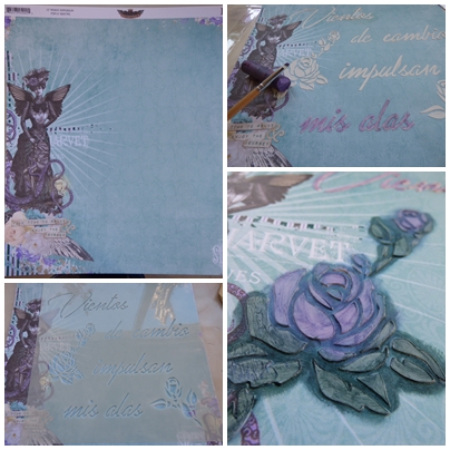Y este papel tan bonito también con relieve de un texto. Una vez seco el relieve sin volver a poner la plantilla (en este caso) he ido pintando con cera al óleo verde claro y un pincelito muy fino.....como en la rosa de antes, además de pintar donde está la pasta de relieve, se pinta un poco el papel y queda muy chulo