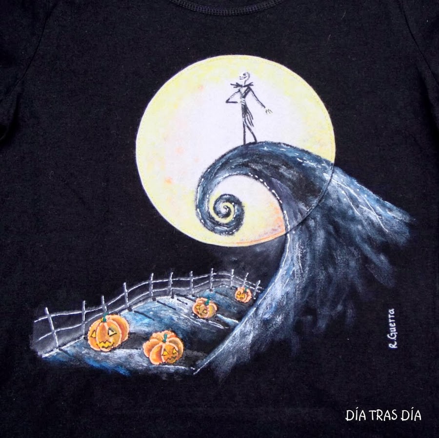 Esta camiseta fue un encargo que me hizo mi amiga Ana para regalar a su sobrina, que es una fan total de Tim Burton. Tardé un poco en hacérsela, por aquello de que había confianza y siempre la iba retrasando, y al final se la he entregado hace poquitos días. Aunque igual ha venido bien el retraso, porque por la temática viene que ni pintado para la próxima celebración de Halloween que se acerca.