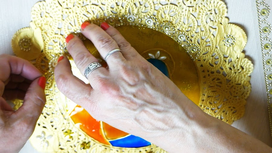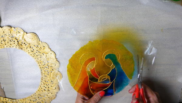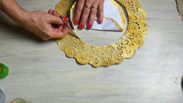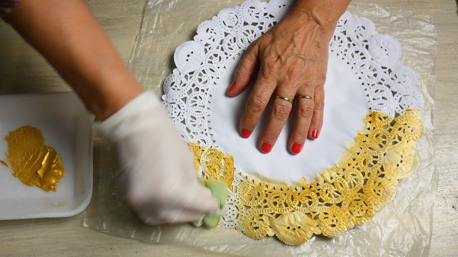 Tenemos que recortar el centro de la blonda, siguiendo la forma que nos muestra el diseño de la misma, si hace falta y con esponja se puede retocar el color dorado.