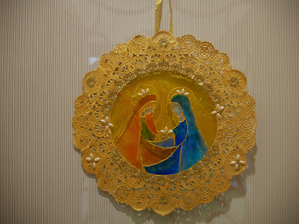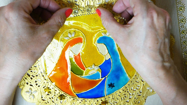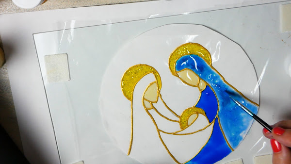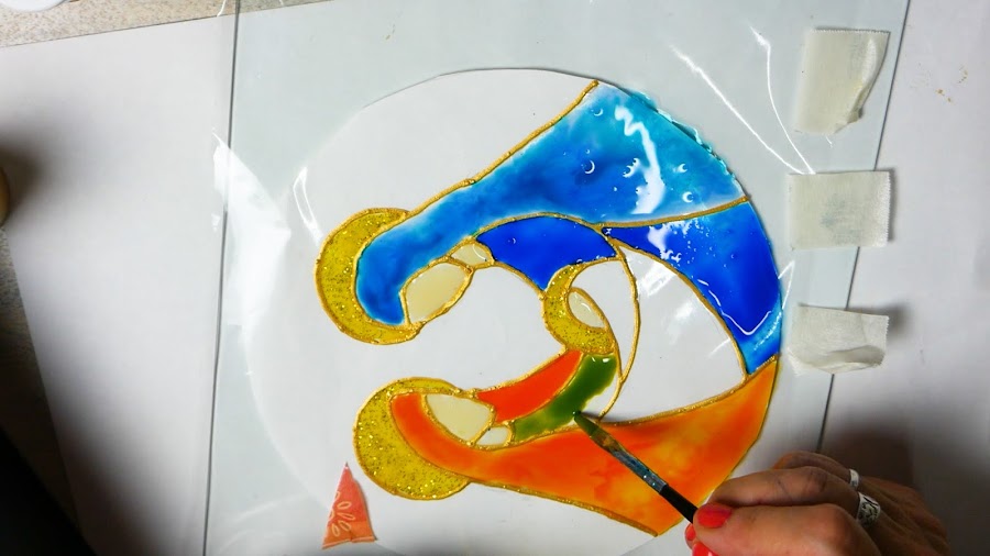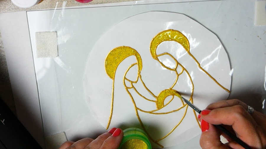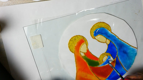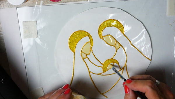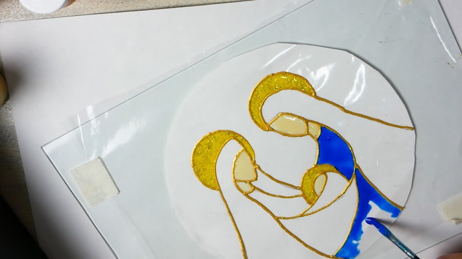 Con la manga y la pintura acrílica remarqué algunas zonas, principalmente en las uniones del vitral con el marco dorado.