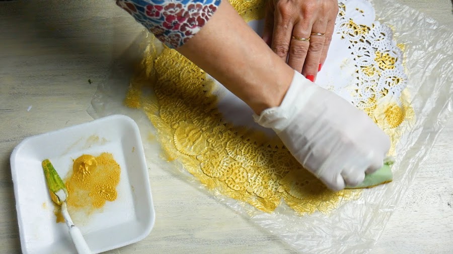 Esta puntilla se pinta de ambos lados, para que quede un trabajo prolijo. Lo realizo con esponja porque es más fácil y logro que penetre bien entre los dibujos de la guarda.