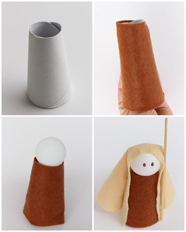 Engancharemos con silicona la bola de ping pong que hará de cabeza, y acabaremos de decorar enganchando el manto y el bastón y pintando unos ojos con rotulador negro permanente.