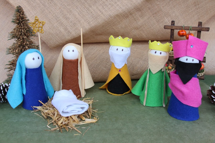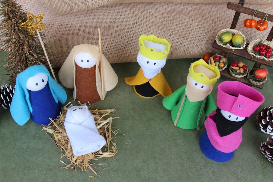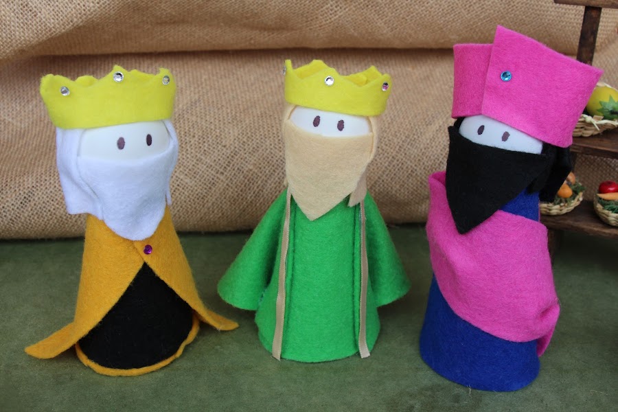 A las figuras de los Reyes Magos les haremos diferentes vestidos, les pondremos pelo y barba de fieltro, a Melchor y Gaspar les haremos unas coronas y a Baltasar un turbante.