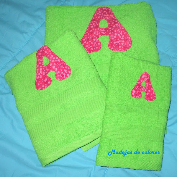 Las toallas en un verde lima y la inicial en tonos fucsias y rosas. Espero que sea de su agrado.