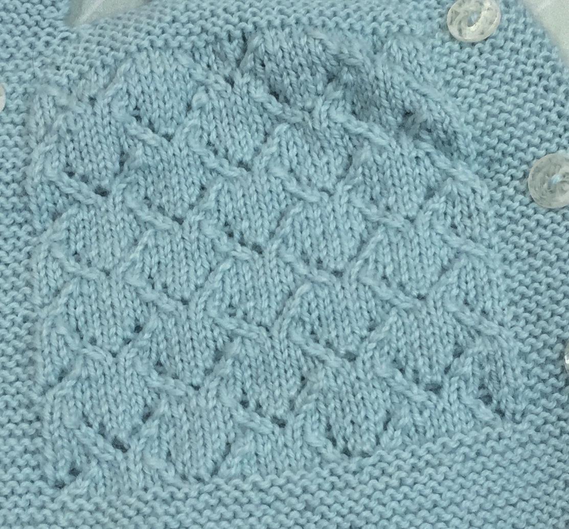 5ª vuelta: 3 puntos del derecho, hebra, 2 puntos juntos del derecho, 4 puntos del derecho, 2 puntos juntos del derecho, hebra, 4 puntos del derecho, 2 puntos juntos del derecho, hebra, 3 puntos del derecho.