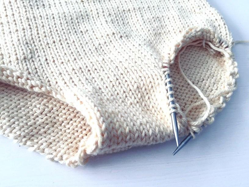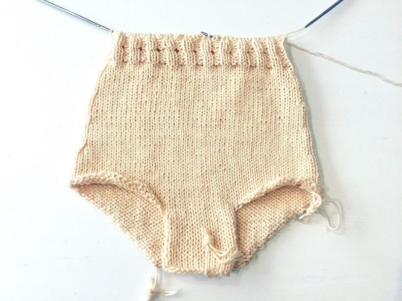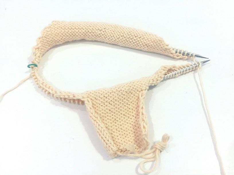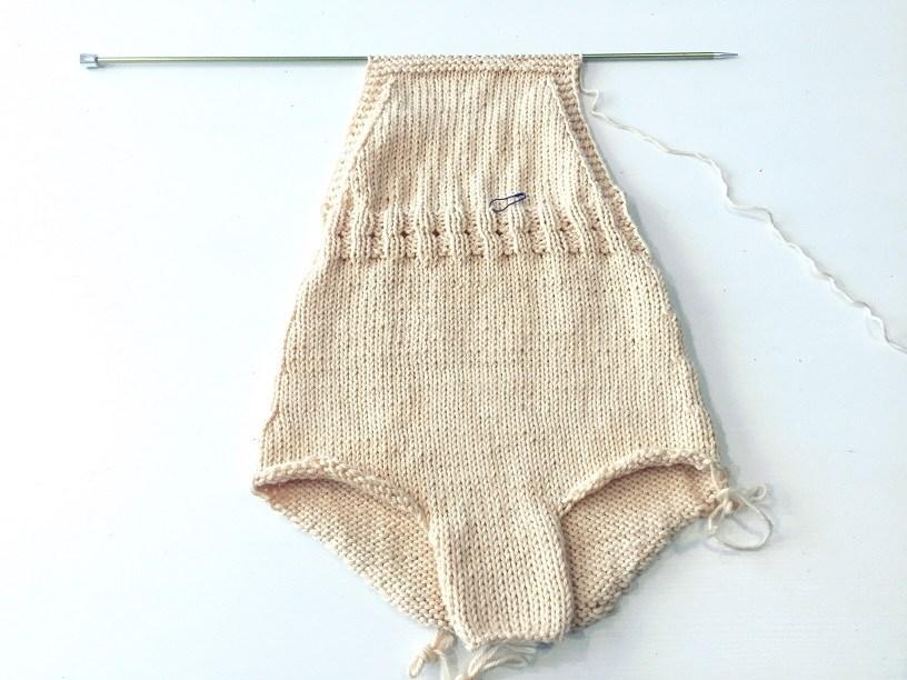 Une los 16 puntos de delantero y trasero de la entrepierna. Puedes ver como unir dos piezas en punto jersey de manera vertical aquí.Levanta 56 puntos en el hueco de la pierna. Si has levantado alguno más, ajusta a 56.