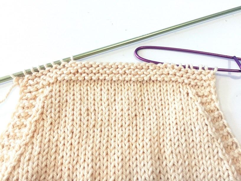 Pasada 10 – 12: 1 deslizado, 3 derecho, 32 punto jersey, 3 derecho, 1 revés.