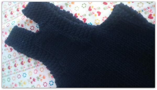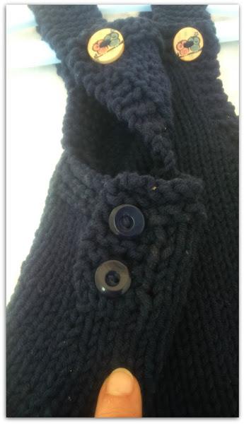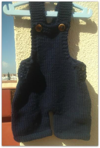 Empecé por las piernecitas, una a una . Subí puntos para hacer el dobladillo y ya terminadas las uní en circular añadiendo al centro unos tres puntos centrales para la pernera. Continué en circular e hice pliegues laterales para los botones. Ya aquí separé para el peto delantero y la espalda.