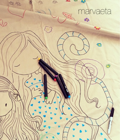 Con una sábana que teniamos, usamos rotuladores de tela. El dibujo lo marcamos a lapiz proyectando una imagen con un proyector sobre la sábana. Los hicieron las marvaetas, así que no fue nada complicado. Si no tenéis proyector podéis fabricaros uno con vuestro teléfono como aquí o dibujar a mano alzada. La manera más fácil sería hacer una cuadrícula que se puede borrar tanto en la imagen como en la tela e ir cubriendo cada cuadrado para que el dibujo nos quede proporcionado al ampliarlo.