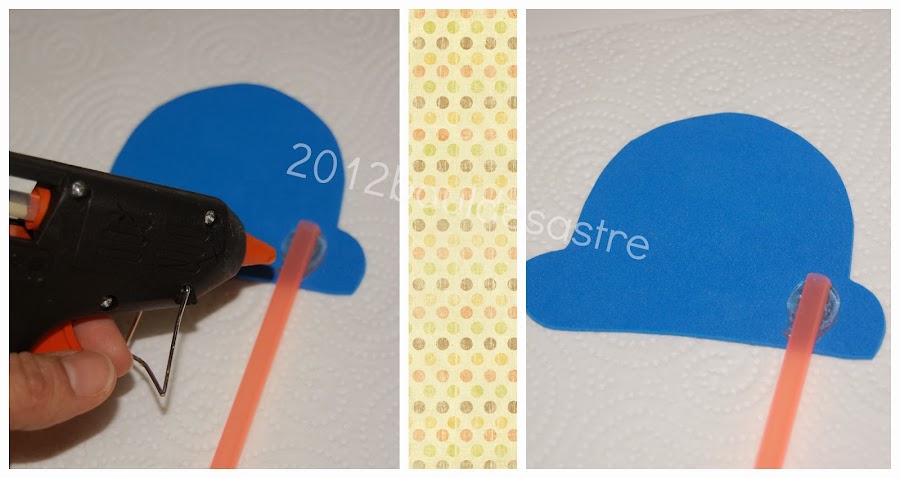 Ahora con la silicona caliente pegamos las pajitas en la parte trasera de los objetos.