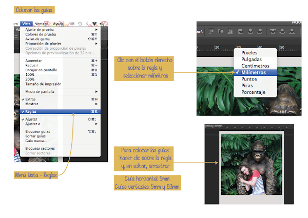 Ahora nos toca colocar la imagen, para ello vamos a poner unas guías para luego situar la foto sobre ellas. Para sacar las guías tenemos que tener activadas las reglas, de normal suelen venir, pero si no las tenemos, vamos al menú Vista y seleccionamos Reglas. Una vez tenemos esto, hacemos clic sobre las reglas y sin soltar vamos arrastrando y nos aparecerán, sólo restará poner las reglas a 5mm de los bordes superior, derecho e izquierdo. Para que las reglas nos aparezcan en mm y no en pixeles, hacemos clic con el botón derecho sobre las reglas y seleccionamos milímetros.