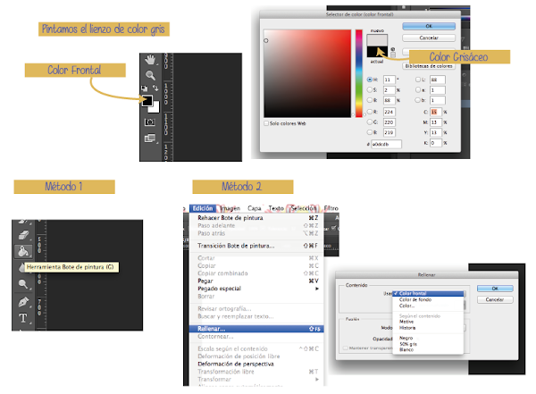 Hay dos maneras de rellenar tooodo el fondo de un mismo color. Lo primero que tenemos que hacer es seleccionar el color, para ello vamos al iconito de color frontal y haciendo clic se nos abre el selector, de ahí buscamos uno que nos guste. Una vez hecho esto podemos hacer: