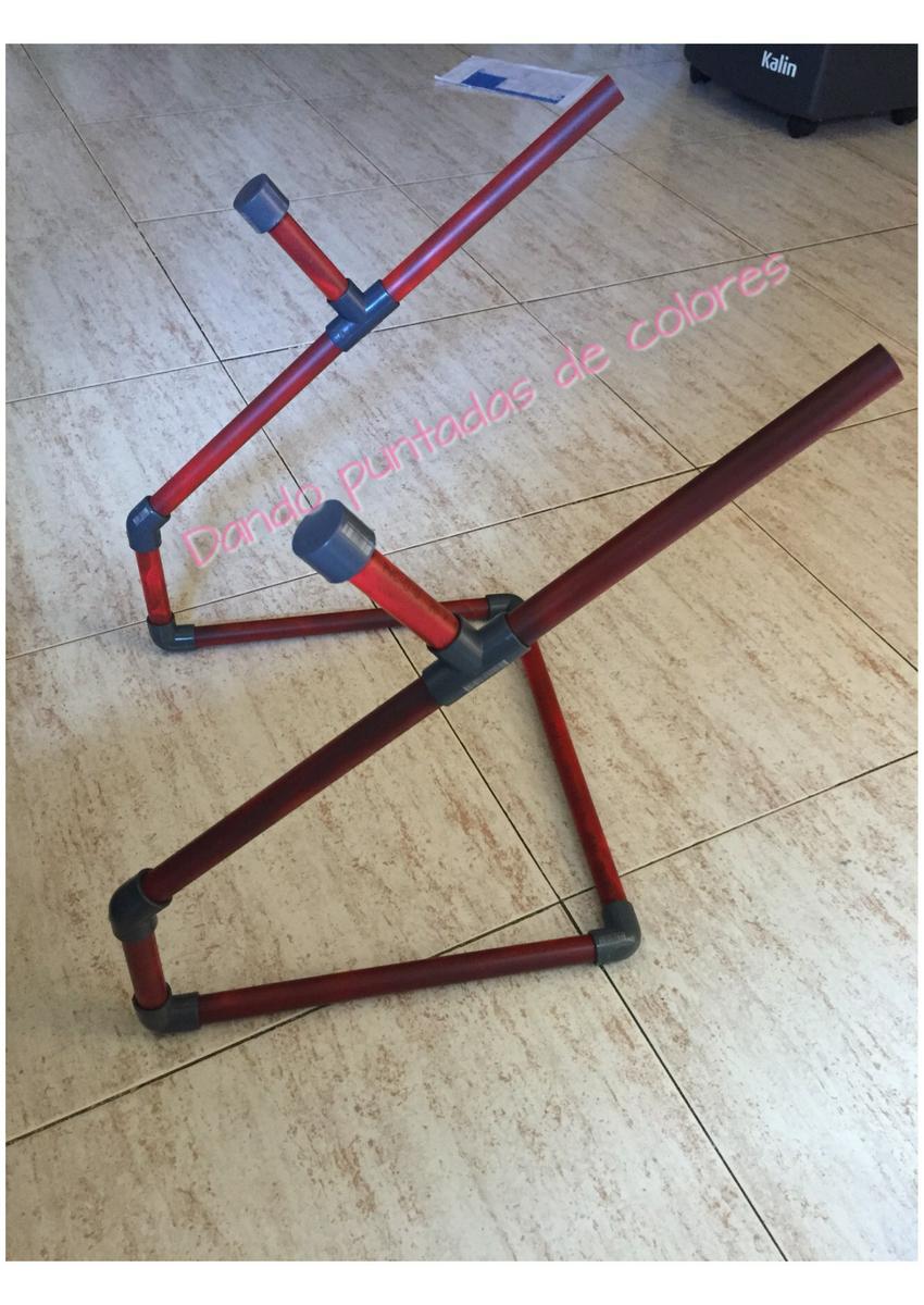 Es un pie de bastidor para sofá. Está hecho con tubos de pvc que he comprado el Leroy Merlin (aprovechando que mi hermana tenía que ir a x unas cositas). Es justo un pie de bastidor a mi tamaño, está pintado con spray de color flúor… El cual no hemos pintado para que quedara uniforme… Si no que solo hemos dado una capa y así se queda desuniforme.