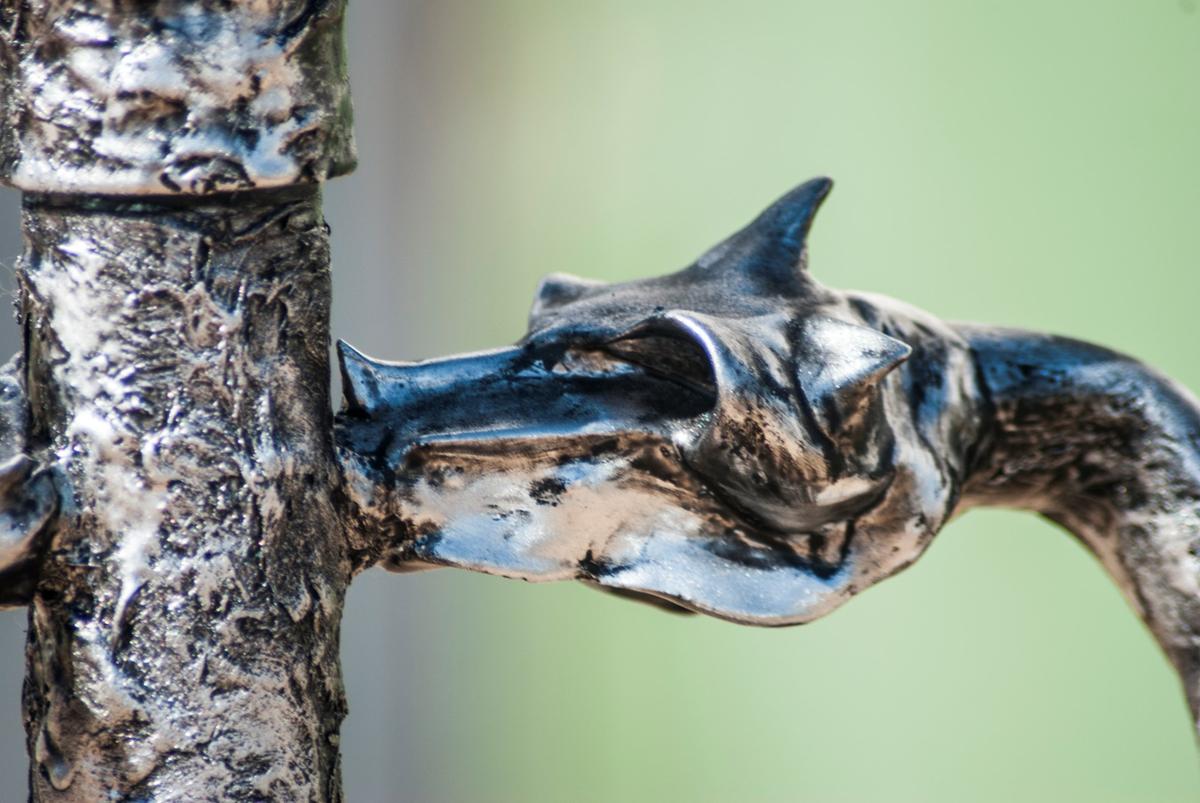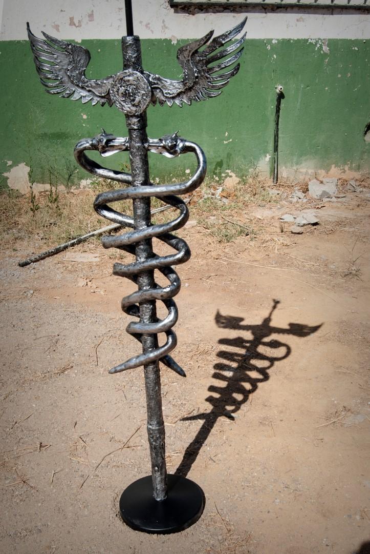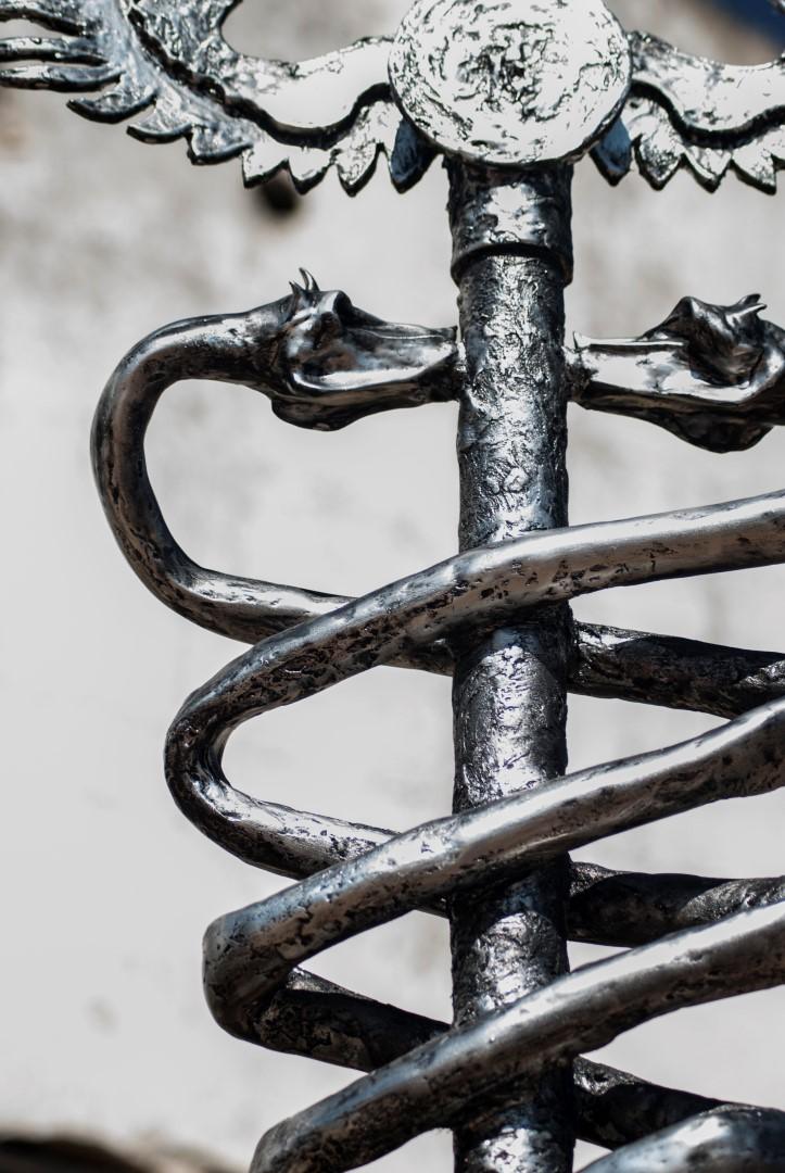 Esta vez Sarah nos pidió un pie con forma de caduceo (Con la salvedad de que las cabezas fueran dragones en lugar de serpientes) y en color plata.