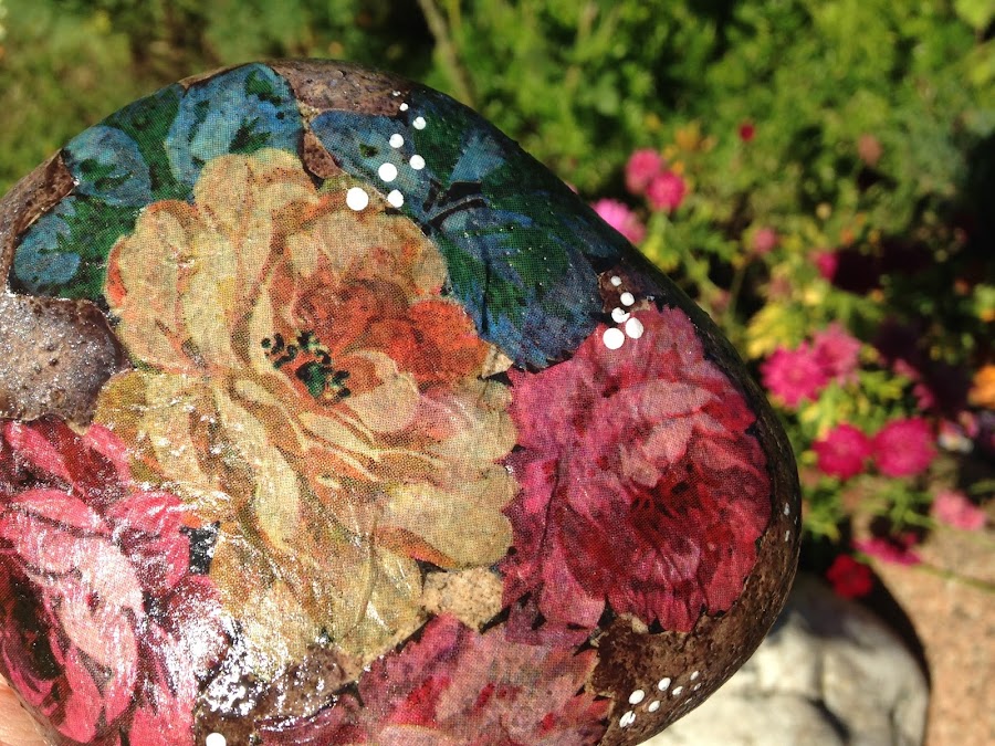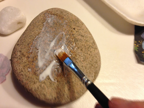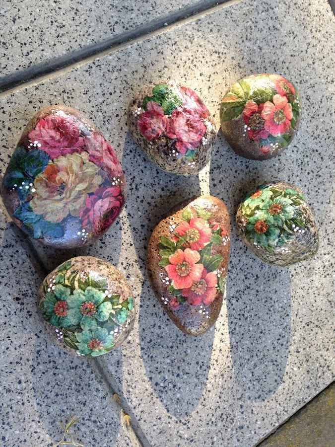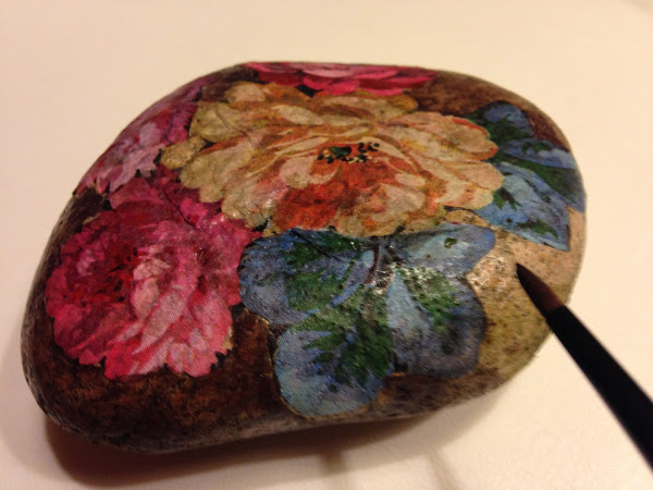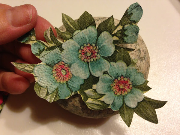 Una vez elegido el motivo de la servilleta de papel la recorte y la presente sobre la piedra para ver cómo la iba a pegar.