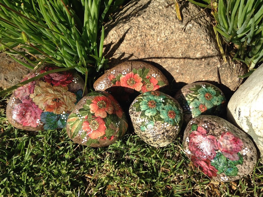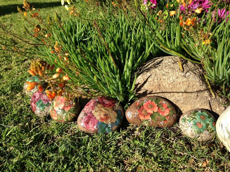 Acá están, me gusto mucho en esta parte del jardín. Les puede dar el sol y la lluvia sin problema porque una vez seco el decorado se les da dos manos de barniz en aerosol.
