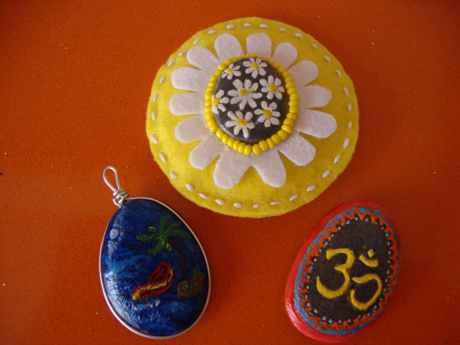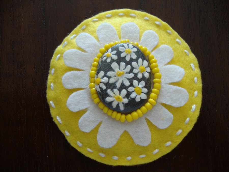Sobre la primera, que es muy planita, pinté unas margaritas y la aproveché junto con unos abalorios enhebrados en un anillo y unos trozos de fieltro, para hacer una composición para un broche estilo "flower power".