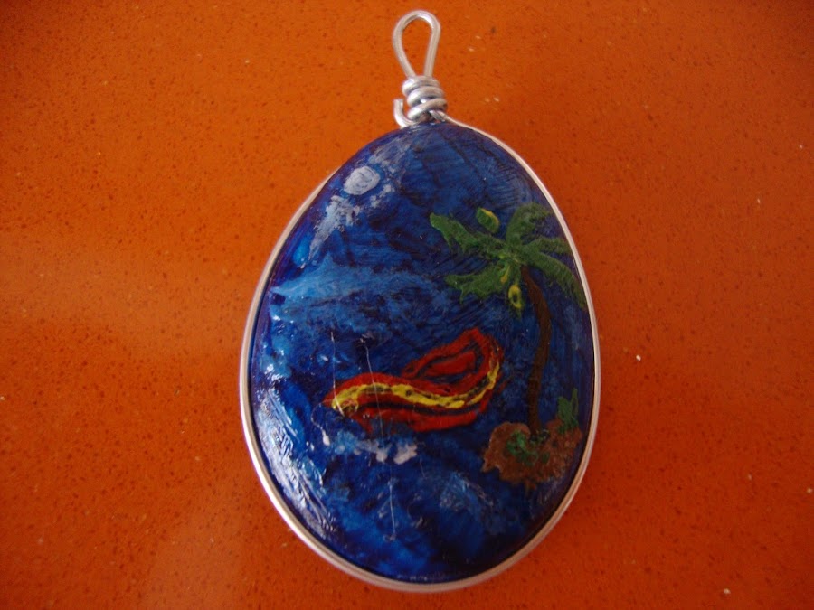 En la segunda pinté una escena marinera nocturna. Después con alambre sujeté bien la piedra e hice un anclaje para poder usarlo de colgante. Por detrás lo aseguré con silicona para que no se mueva y se pueda caer con el uso.