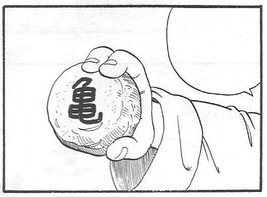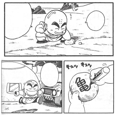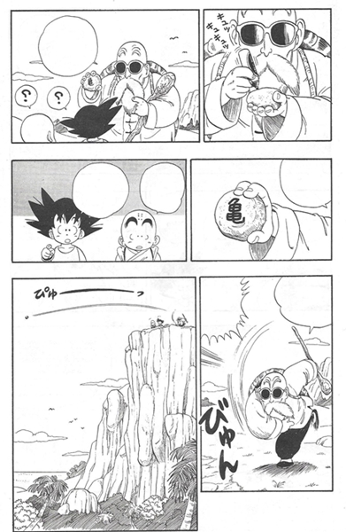 En el tomo 3 del manga de Dragon Ball o en el episodio 16 del anime Dragon Ball, Son Goku y Krilin empiezan el entrenamiento con el Duende Tortuga/Maestro Mutenroshi y, como "aperitivo" antes del duro entrenamiento, el maestro busca una piedra y con un rotulador negro escribe en ella el símbolo "tortuga", luego lanza esta piedra desde un acantilado hasta un bosque que está a los pies del acantilado y explica que la primera prueba consiste en encontrar esa piedra antes de que la cena esté lista, quien la encuentre cena y el que no la encuentre no cena.