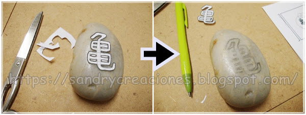Paso 2. Pasar el dibujo a la piedra y pintarlo. Una vez realizado el símbolo en un papel lo cortamos y reseguimos su silueta en la zona de la piedra donde queremos realizarlo. Terminamos el símbolo en la piedra y una vez listo empezamos a pintar su interior con pintura acrílica de color negro.
