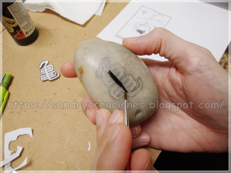 Paso 1. Buscar o dibujar en un papel el dibujo que queremos pintar en la piedra. Nosotros teníamos claro lo que queríamos hacer con esta piedra.