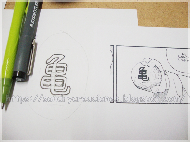 Para tener una guía para realizar el símbolo "tortuga" en la piedra realizamos un dibujo del símbolo intentando hacerlo igual a como aparece en el manga de Dragon Ball.