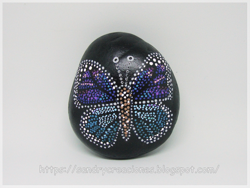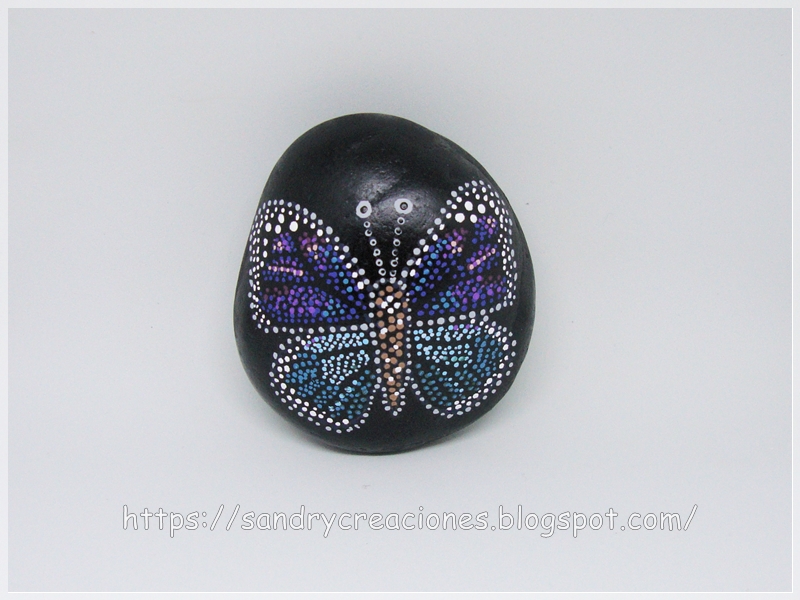 Paso 2. Buscar, pensar, o diseñar el dibujo que queremos realizar con la técnica de puntillismo. Esta técnica, para los que no lo sepáis consiste en ir realizando un dibujo e ir rellenándolo a base de puntos de diferente tamaño y/o color. En nuestro caso nos decantamos por una mariposa, de la cual imprimimos su silueta y la dibujamos a lápiz de forma suave en la piedra para tenerla como guía.