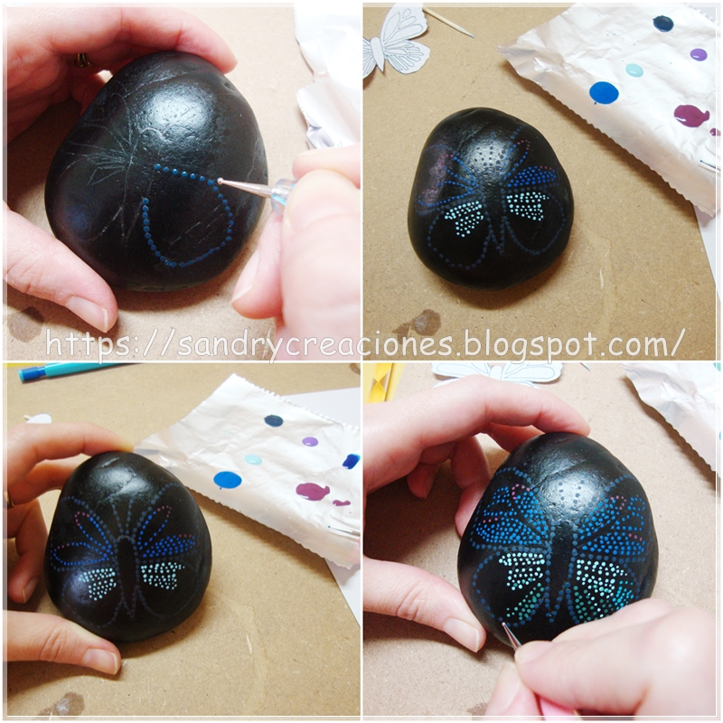 Paso 3. Realizar la mariposa con la técnica del puntillismo. Una vez marcada suavemente la silueta de la mariposa en la piedra podemos empezar a aplicar la técnica del puntillismo. Para tener una pequeña guía podemos marcarnos a lápiz todas o algunas partes de la mariposa o bien, podemos rellenarla con puntitos a ojo. Para ir rellenándola utilizaremos pinturas acrílicas que aplicaremos utilizando buriles de diferente tamaño para realizar puntos de diferente medida según el color de la pintura acrílica. Nosotros utilizamos mayoritariamente buriles de puntas pequeñas.