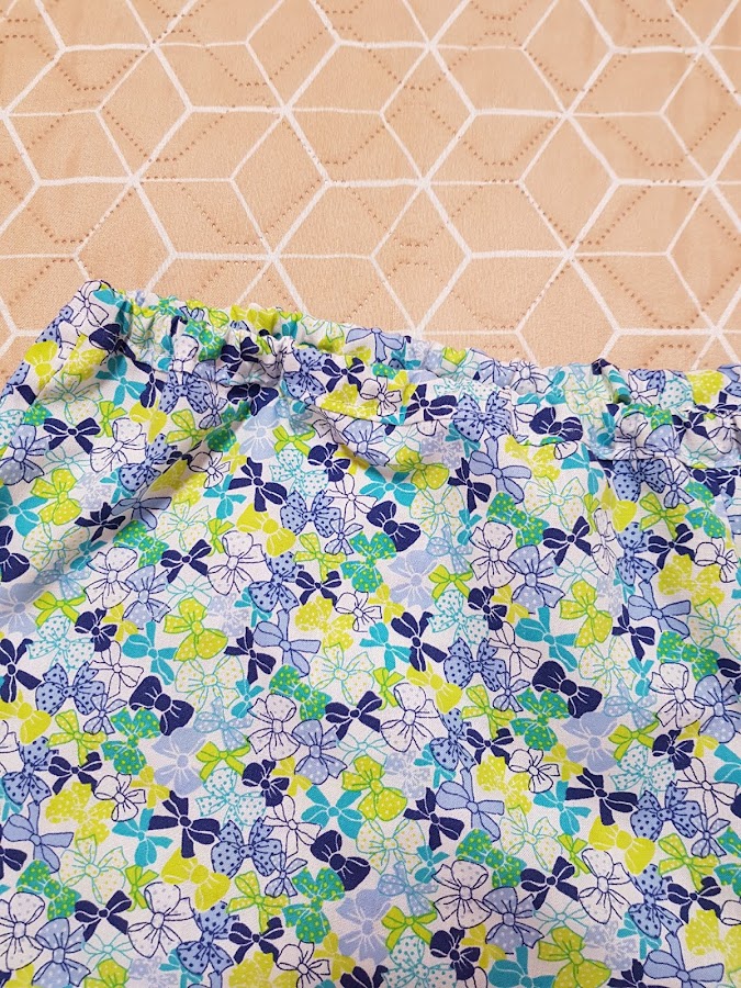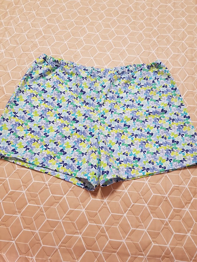 Para los pantalones cortos del pijama los he cosido en tejido de algodón , sin elasticidad , con un dibujo muy bonito de lacitos de diferentes colores.
