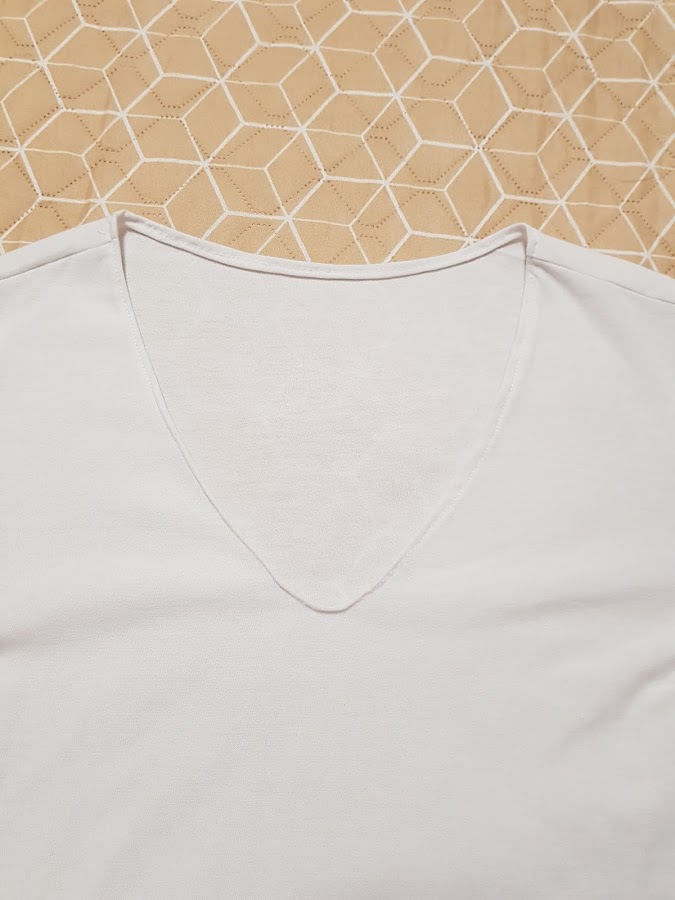Como no quería hacer típico cuello redondo con tela de puño he optado por hacer el cuello con escote de pico , que también es más fresquito para el verano , para pulir el cuello tan sólo le he hecho un dobladillo pequeñito por todo el alrededor.