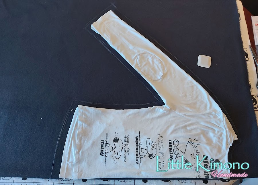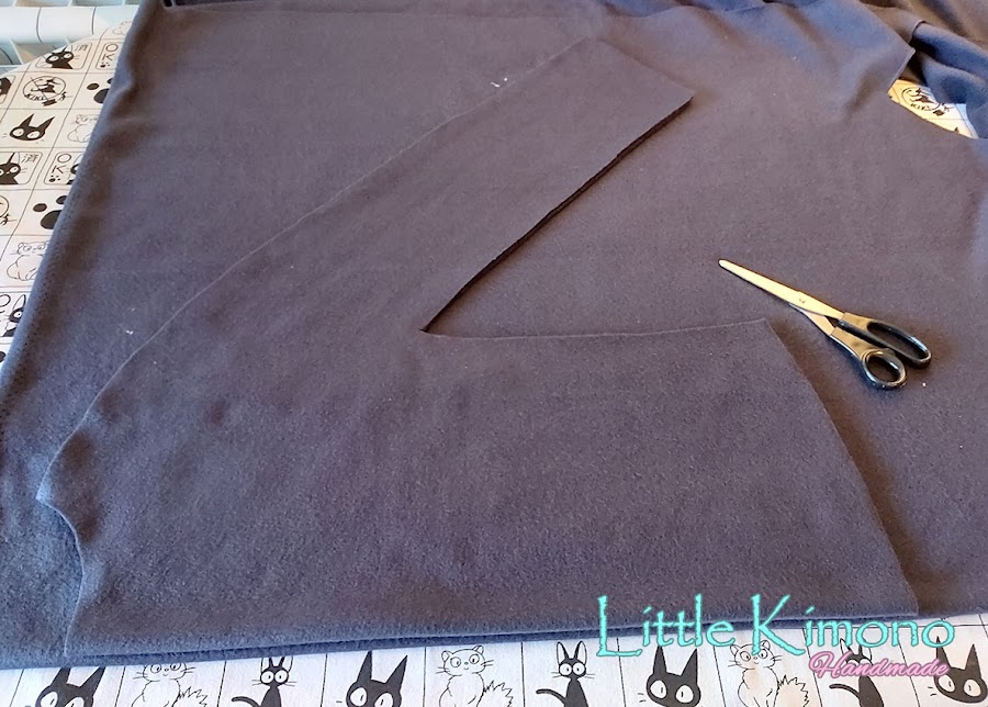 1. Doblamos la tela polar por la mitad.Ahora doblamos la blusa que nos gusta y la colocamos sobre la tela como muestra la imagen. Yo lo he hecho de tal manera que la parte frontal de la blusa quedaba hacia adentro, así podía sacar el patrón de la parte más alta del cuello teniendo como referencia el cuello de la espalda (espero explicarme bien^^ sino preguntadme)