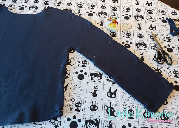 Sujetamos ambas telas con alfileres y cosemos mangas y costados.