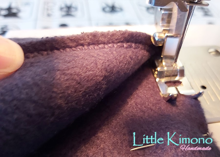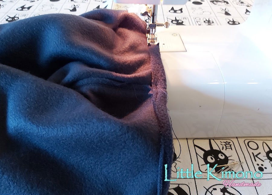 Lo haremos bien pegadita al borde doblado de la tela polar y marcamos con tiza de sastre dejando 1cm más o menos para las costuras.