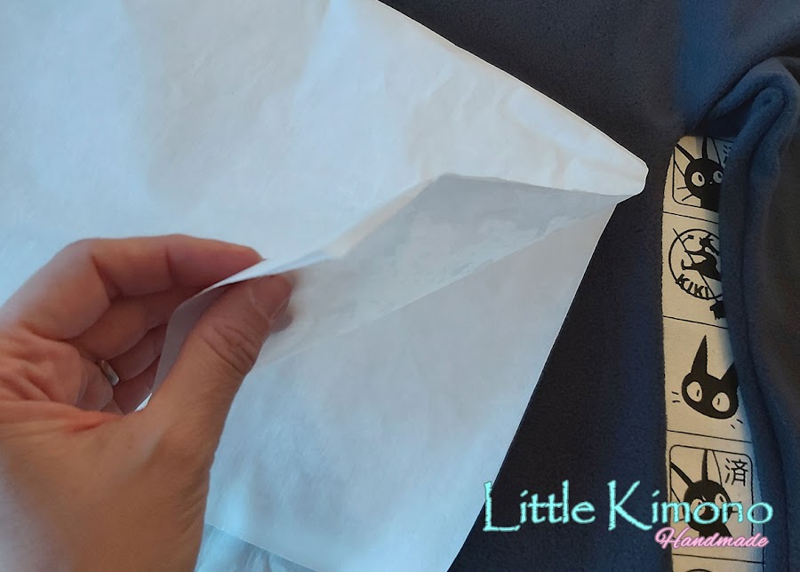 2. Ahora colocamos la entretela sobre la tela que deseamos y planchamos (sin vapor). Dejamos la parte del papel mirando hacia arriba y la cubrimos con una tela para protegerla del contacto directo con la plancha.