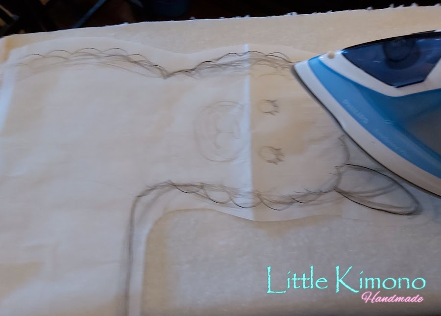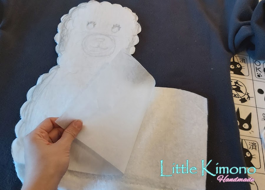 4. Ahora retiramos el papel protector de la entretela, colocamos sobre la blusa y planchamos para fijar el pegamento. Igualmente podemos cubrir con otra tela para proteger el borreguito.