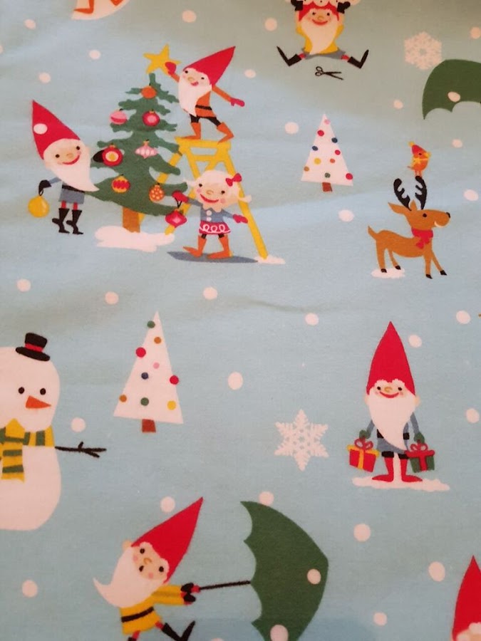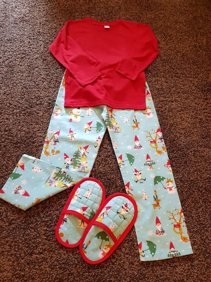 El pijama de mi hijo pequeño es la tela de gnomos con camiseta de color rojo a juego.