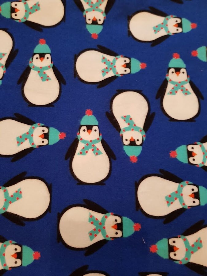 Esta franela es de ROBERT KAUFMAN con estampado de pingüinos con bufanda y gorro.