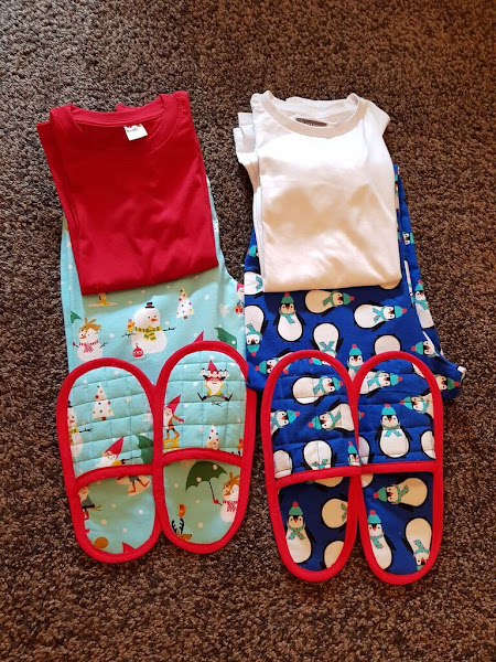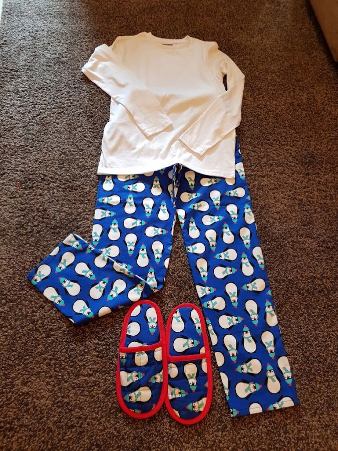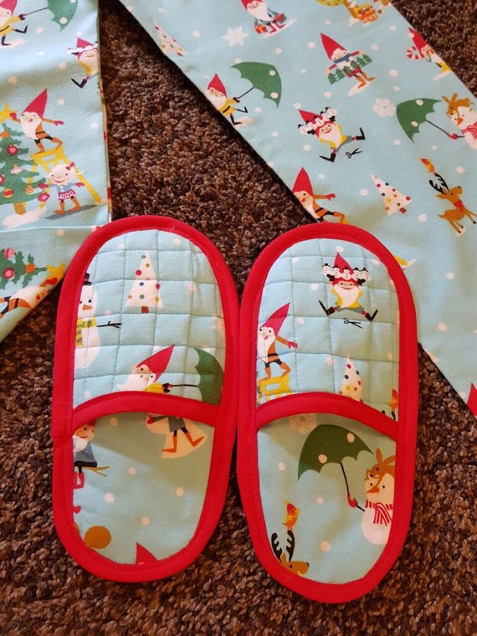 Y este es el resultado un par de pijamas de invierno con sus zapatillas a juego , las camisetas son basicas compradas , ni que decir que las telas son de muy buena calidad y los colores son impresionantes.