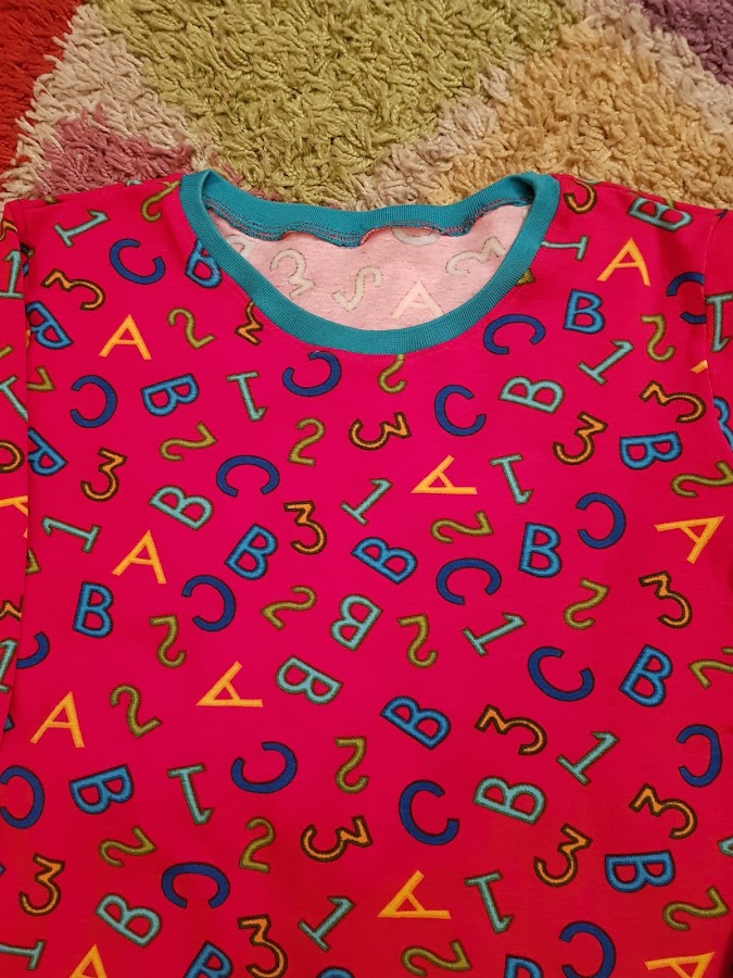 Para el cuello del pijama utilize puño de color azul turquesa que hace juego con el color de algunos numeros y letras y ademas le deba un toque diferente al pijama.