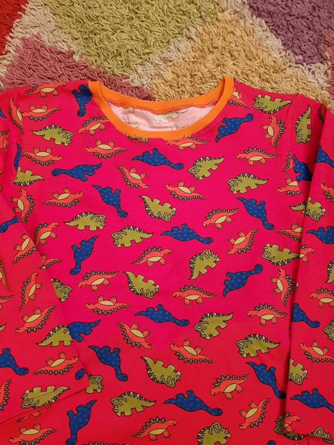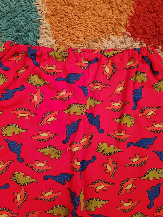 El tejido del segundo pijama tambien es de punto elastico tipo camiseta , el fondo tambien es de color rojo pero el estampado es diferente este lleva dibujo de dinosaurios de diferentes colores.