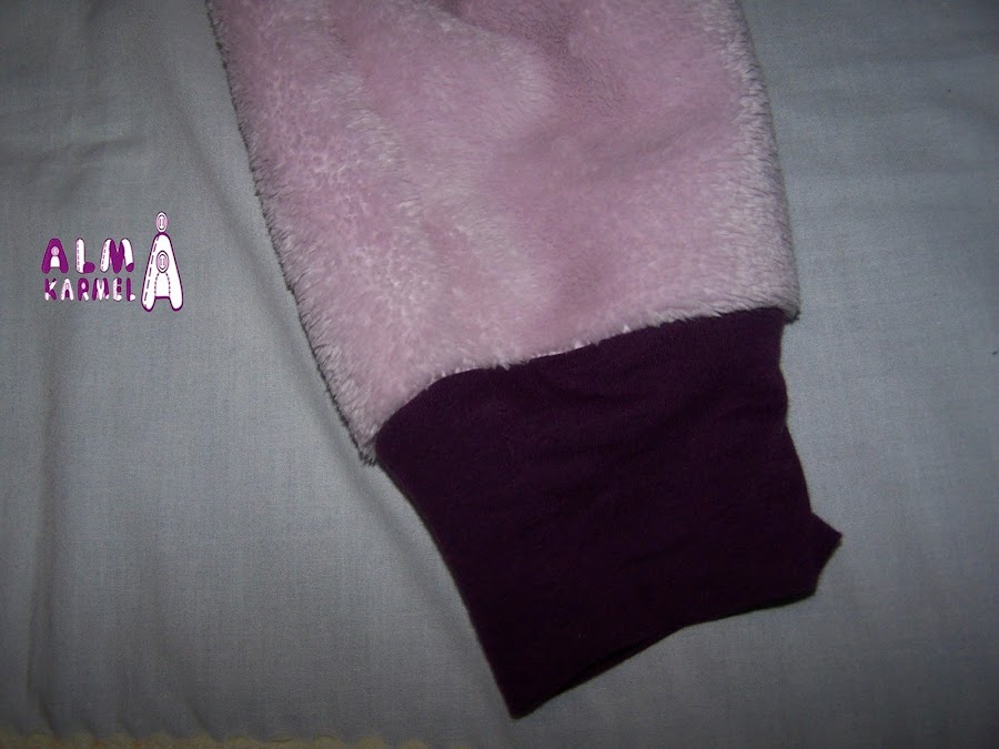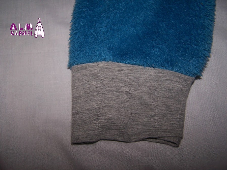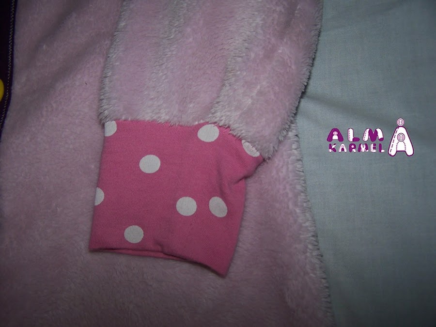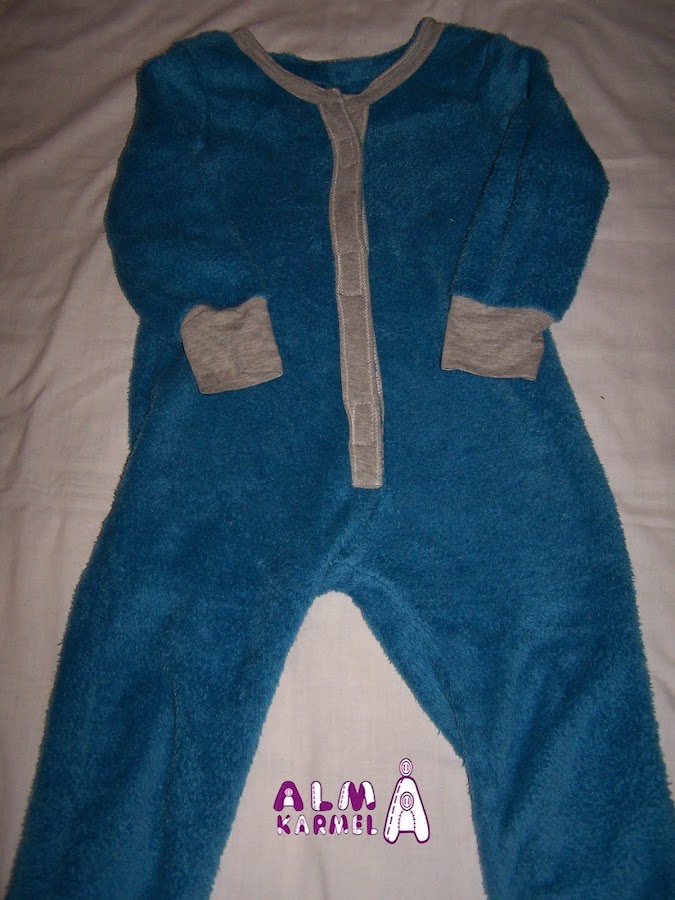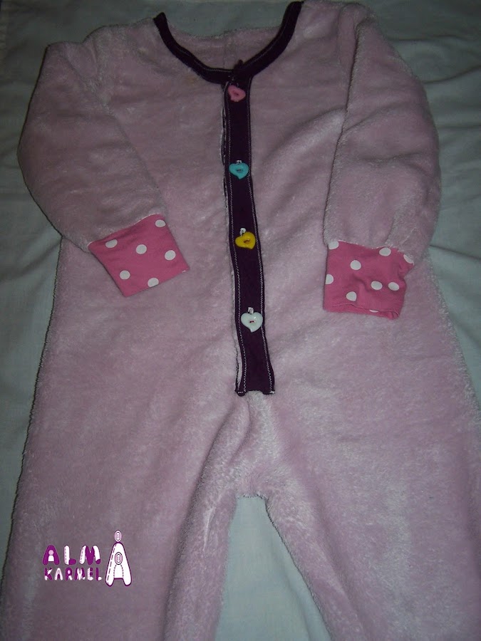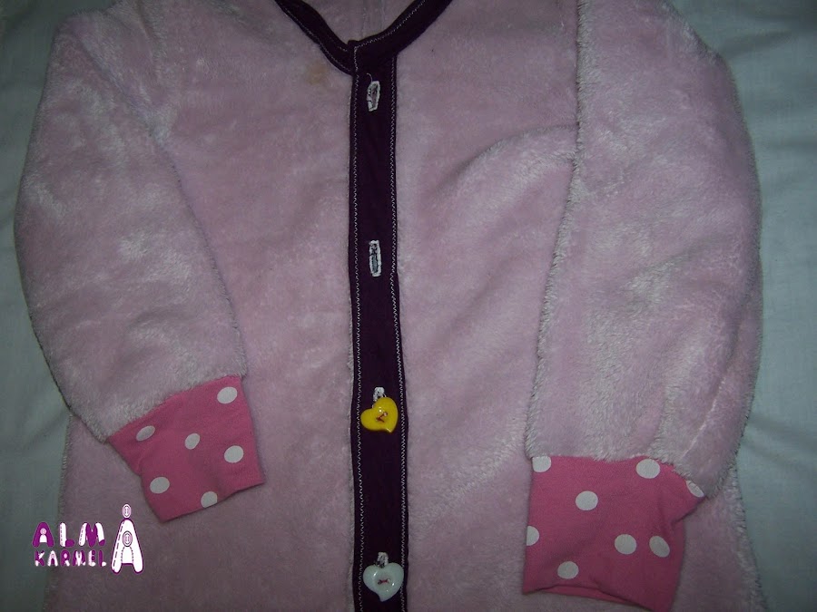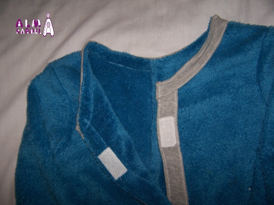 Para el cuello, puños y tapetas he reciclado una camiseta vieja. Para abrocharlo le he puesto velcro, porque eso de desabrochar botones aún no se nos da bien, y si nos levantamos al baño por la noche, el velcro es más rápido y llegamos a tiempo, jejejeje......
